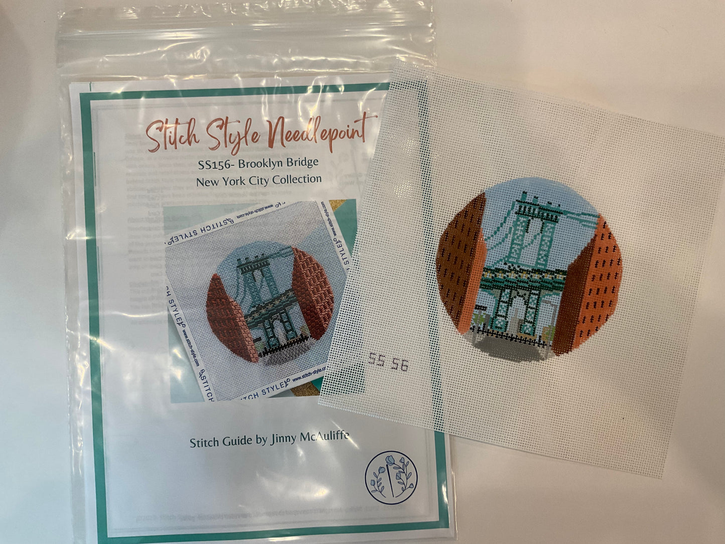 18 mesh, 4” round, this canvas comes with a complete stitch guide by Jinny Barney McAuliffe