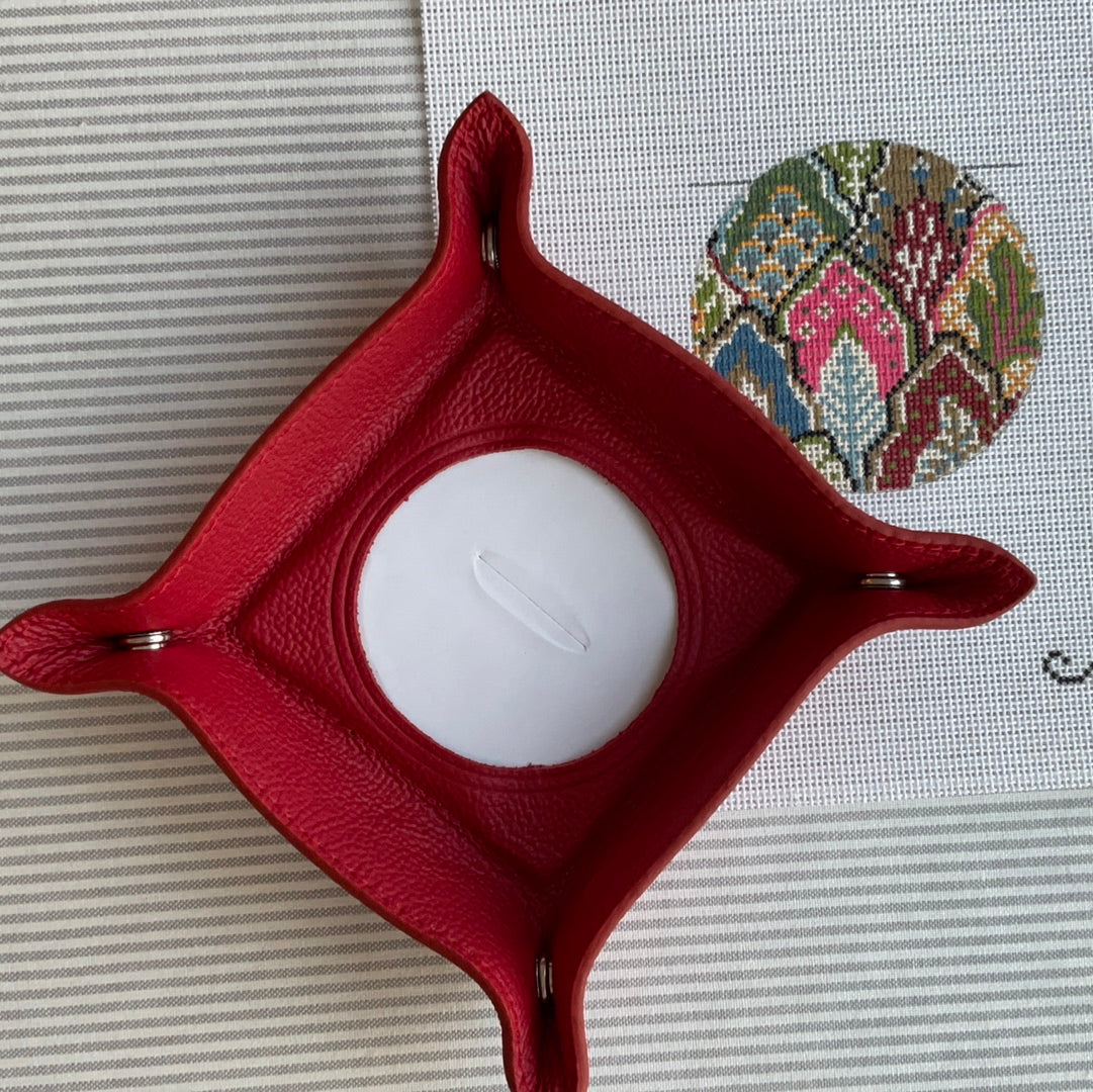 Snap Tray in red pebbled leather. Fits a 3”round canvas perfectly (sold separately).